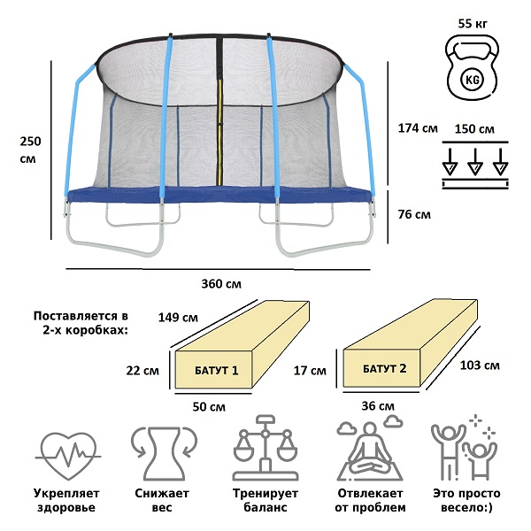 Регулярное использование батута позволяет укрепить сердечнососудистую систему, улучшить кровообращение и лимфообмен. Прыжки на батуте превосходно развивают координацию движений. Используя батут ребенок задействует множество групп мышц, развивая их. Батут Green Glade B122 – отлично подходит для размещения возле загородного дома или дачи.