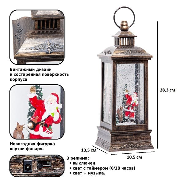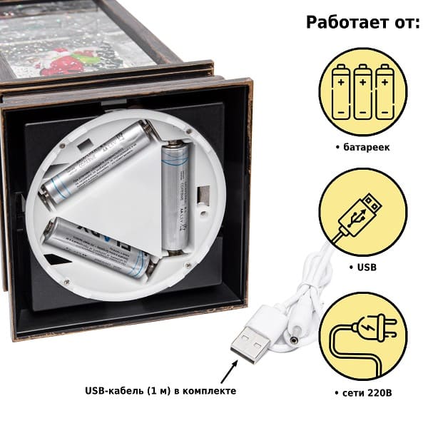 Декоративный новогодний фонарь Winter Glade станет ярким украшением дома в период новогодних и рождественских праздников. Работает фонарь от 3 пальчиковых батареек типа АА (в комплект не входят), USB шнура (входит в комплект) или сети 220V (адаптер в комплект не входит). Фонарь имеет 2 рабочих режима: 1 - подсветка, механизм мерцания, кружится снег и начинают играть по очереди 8 мелодий; 2 -подсветка + механизм мерцания без музыки.