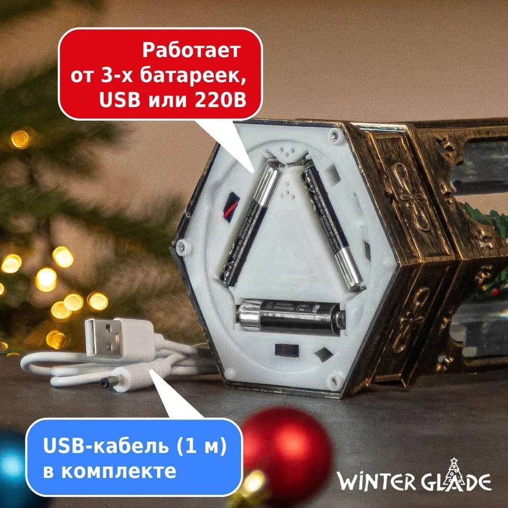 Декоративный новогодний фонарь Winter Glade станет ярким украшением дома в период новогодних и рождественских праздников. Работает фонарь от 3 пальчиковых батареек типа АAА (в комплект не входят), USB шнура (входит в комплект) или сети 220V (адаптер в комплект не входит). Фонарь имеет 2 рабочих режима: 1 - подсветка, механизм мерцания, кружится снег и начинают играть по очереди 8 мелодий; 2 - подсветка + механизм мерцания без музыки.
