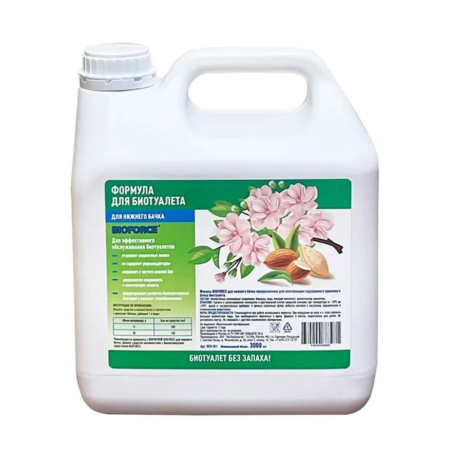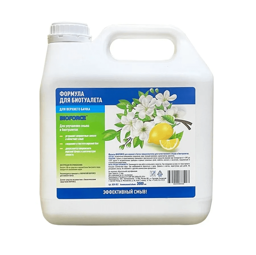 Жидкость для биотуалета ФОРМУЛА БИОФОРС для верхнего бачка предназначена для качественного смыва в биотуалетах. Средство устраняет неприятные запахи, облегчает смыв, сохраняет в чистоте нижний бак биотуалета.При применении данного средства допускается опорожнять нижний бачок биотуалета в септическую емкость. Эффект средства: удаление запаха, улучшение качества смыва. Вносите по 50мл ФОРМУЛА BIOFORCE при каждой заправке верхнего бачка водой.