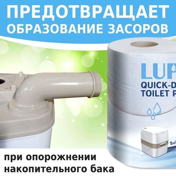 Туалетная бумага для любых видов биотуалетов. Растворяется после использования, в отличие от обычной туалетной бумаги. Благодаря легкой растворимости в принимающем резервуаре со специальной жидкостью, в сливном отверстии туалета не создаются бумажные комья, обычно приводящие к засорам.