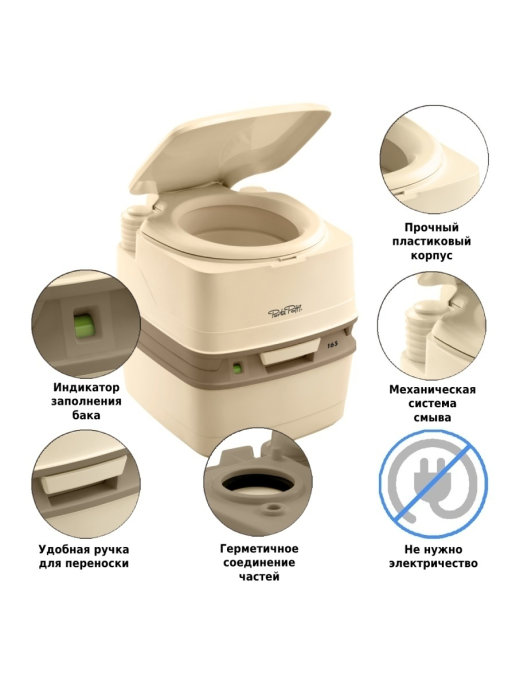 Биотуалет Thetford Porta Potti 165 Luxe - простое и функциональное решение там, где отсутствует стационарная канализация. В модели есть вместительный бак с индикатором заполнения, который вовремя напомнит о необходимости провести очистку. На сливном баке расположен фиксатор, который удерживает сливной патрубок и упрощает процесс присоединения верхней и нижней частей.