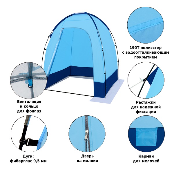 Универсальная одноместная палатка, которую можно захватить с собой на рыбалку, использовать как небольшой навес и даже кабину для душа, туалета или переодевания. В палатку удобно заходит - у нее широкая дверца, которую можно фиксировать лентами. Высота палатки рассчитана так, чтобы в полный рост встал даже высокий человек.