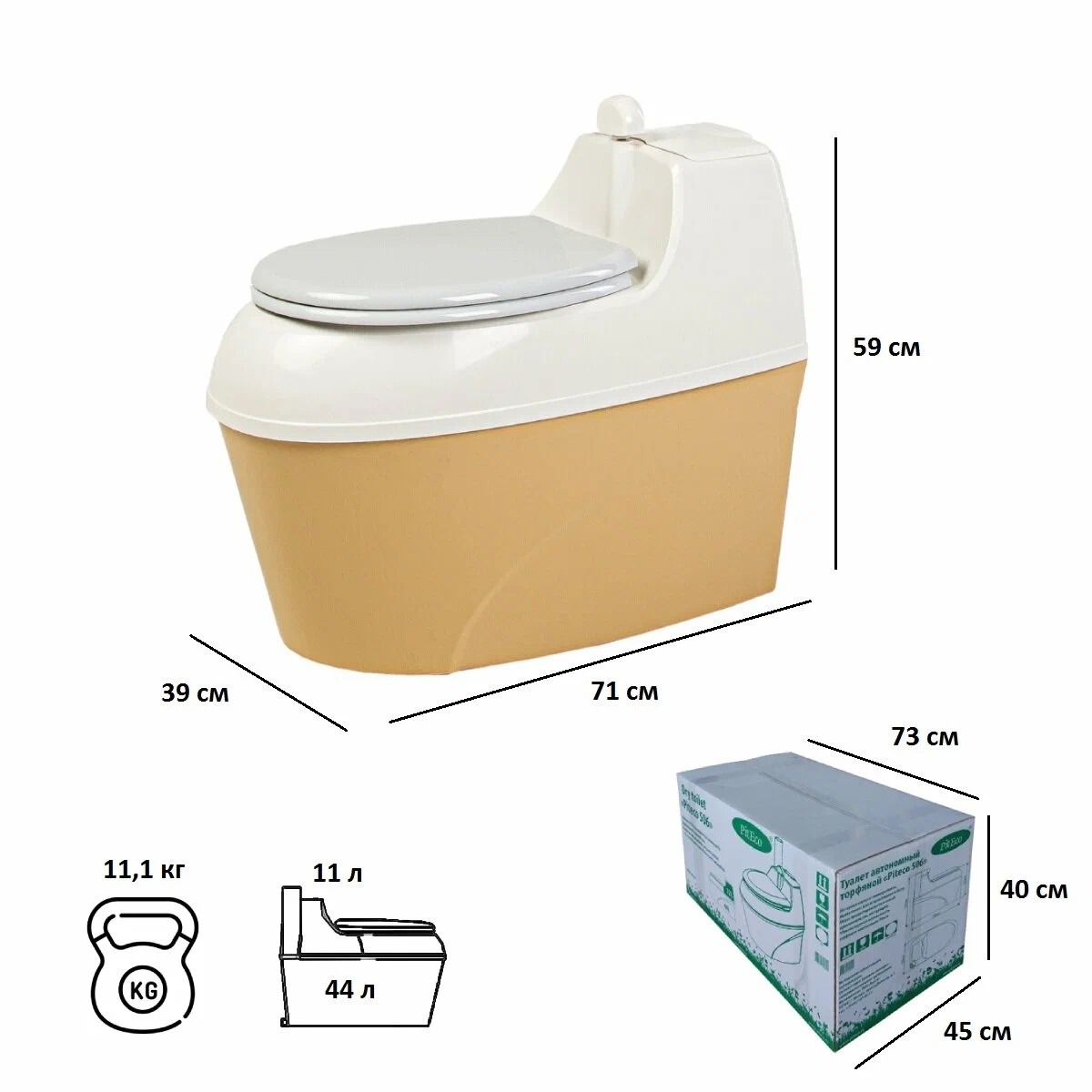 1. Габаритные размеры нашего торфяного туалета достаточно компактны. При объёме туалета 78 литра (накопительная ёмкость 44 литра) ширина туалета составляет 39 см, длина 71 см и высота 59 см, что не превышает размеры стандартного компакт-унитаза, подключаемого к централизованным водоснабжению и канализации.