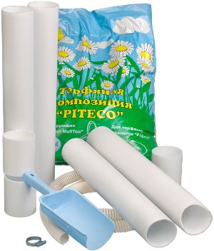 В упаковке туалета в базовой комплектации Вы найдёте 2 метра вентиляционной трубы+ 3 муфты, дренажный шланг 2 метра + один хомут для его крепления, мешок торфяной смеси, сиденье для унитаза с крышкой, паспорт изделия и инструкцию. И, конечно сам торфяной туалет в собранном виде и готовым к эксплуатации после выполнения нескольких несложных операций, оговоренных в инструкции по эксплуатации изделия.