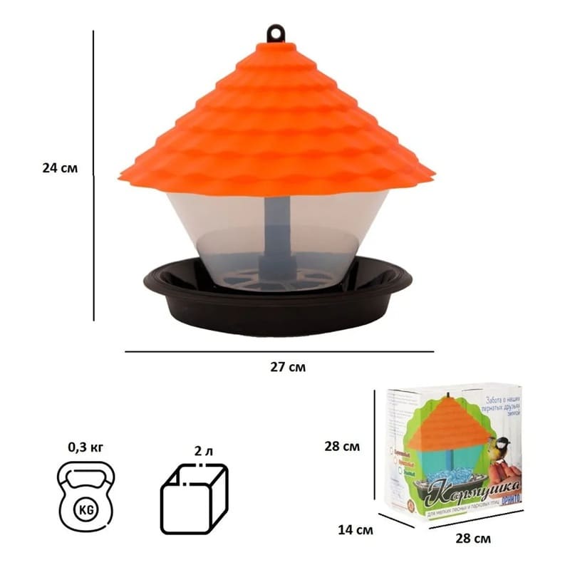 Кормушка уличная для мелких лесных и парковых птиц. Благодаря устойчивости к воздействию ненастной погоды уличную кормушку для птиц можно разместить на даче, в парке, во дворе и в любом другом месте обитания птиц. Изделие выполнено из прочного экологичного пластика и сохраняет корм сухим и чистым, при этом дозируя количество. Также вы можете выбрать удобный вариант установки, например: на шнуре, черенке или даже на земле.