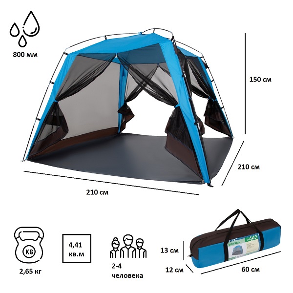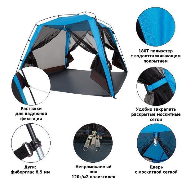 Особенности: Два входа, москитные сетки со всех сторон, защитная юбка по периметру, водостойкость 1000 мм