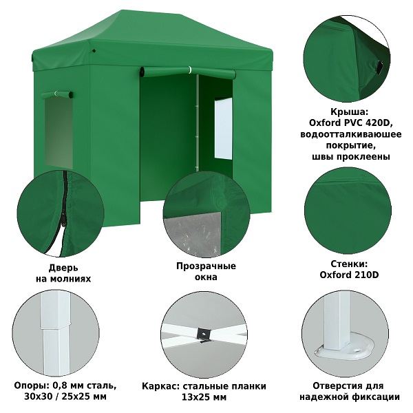 • Боковая стенка: Ткань oxford 210D: 1шт.*3м цельная стенка+2шт.*2м стенка с окном PVC +1шт.*3м ДВОЙНАЯ входная дверь на молнии