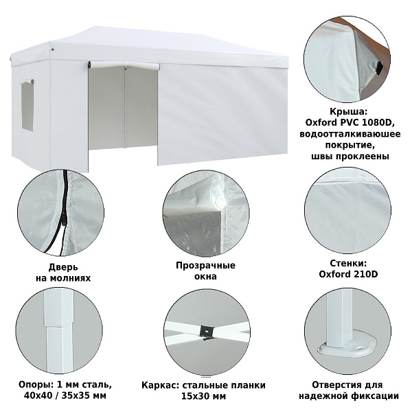 • Боковая стенка: Ткань oxford 210D: 1шт.*6м цельная стенка+2шт.*3м стенка с окном PVC +1шт.*6м ДВОЙНАЯ входная дверь на молнии
