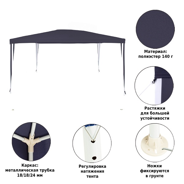 Тент шатер Green Glade 1030 имеет прочный металлический каркас из металлической трубки 19х19х25 мм. Тент выполнен в виде прямоугольника 3x4 метра с прямыми стенками высотой 2,5 м. Покрытие тента полиэстер.