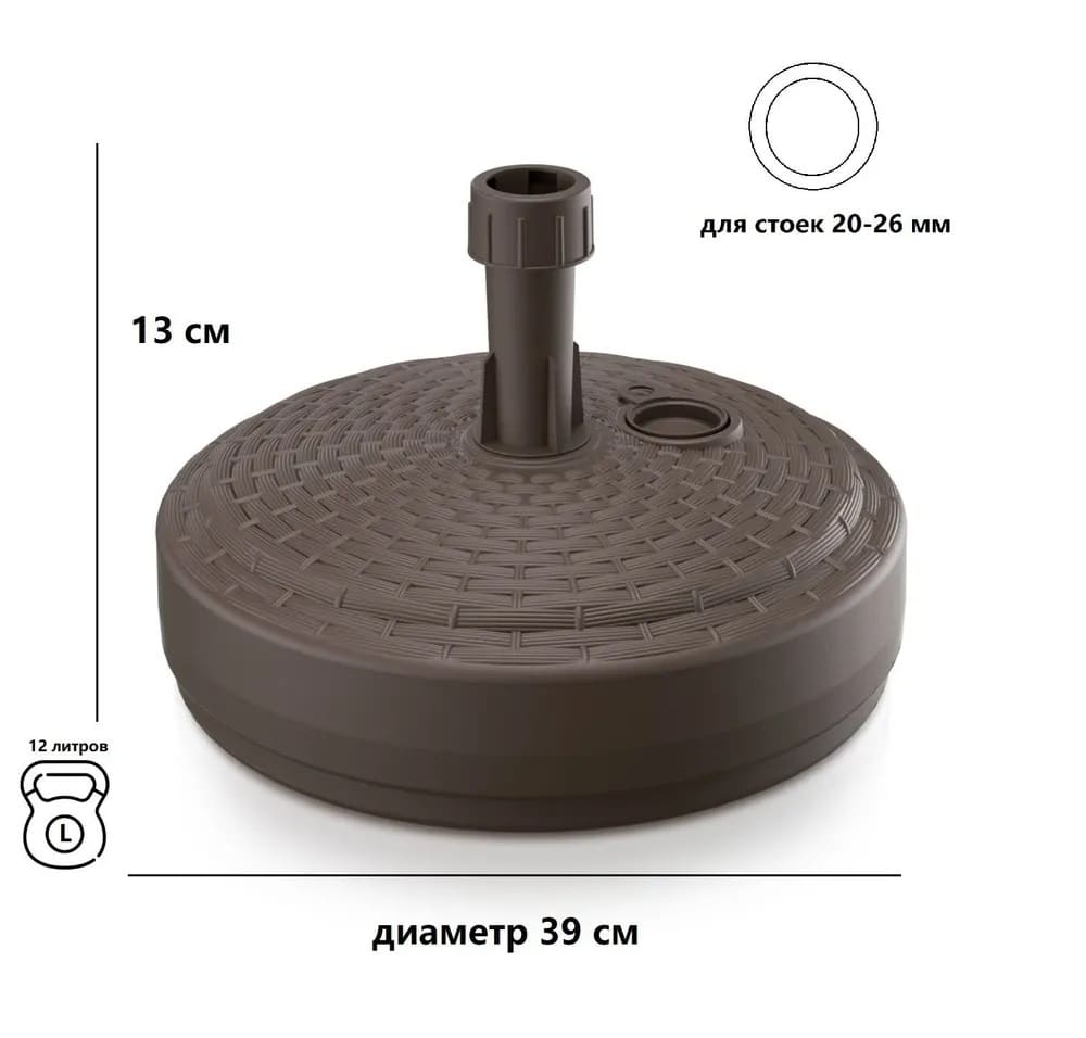 Основание для зонта Umbrella Base из пластика – это надежная и прочная подставка для садовых зонтов, незаменимая в различных поездках, на садовом участке, пляже, в кемпинге. Оно используется с целью установки зонта на ровной поверхности. В основании подставки есть специальная выемка для фиксации зонта. Внутри есть полость для заполнения песком или водой, чтобы утяжелить конструкцию. Благодаря небольшому весу основание для зонта Umbrella Base можно брать с собой, так как оно не займет много места.
