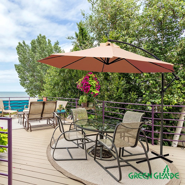 Уличный зонт Green Glade – это надежный и удобный элемент загородного участка или летнего кафе. Зонт можно использовать как во время ненастной погоды для защиты от дождя, так и в жаркий день, чтобы спрятаться от палящего солнца. Благодаря боковому расположению стойки под куполом можно установить любую пластиковую мебель: от дивана или шезлонга до обеденного стола со стульями.