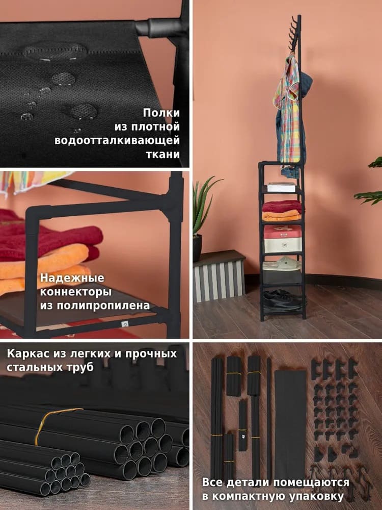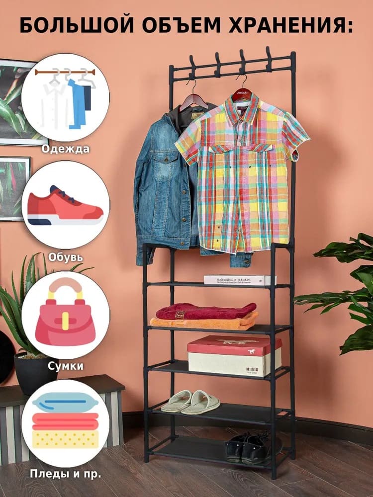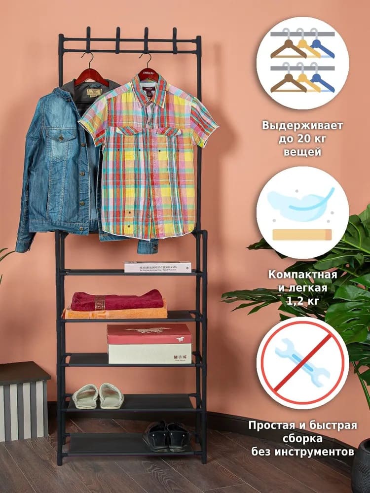 Вешалка органайзер вмещает в себя большое количество различных вещей, а небольшие размеры и современный дизайн позволяют грамотно вписать ее в любое пространство. Также может использоваться как вешалка для детской одежды. Складная открытая вешалка стойка трансформер выполнена из легких металлических труб и пластиковых соединительных элементов, собирается легко и быстро.