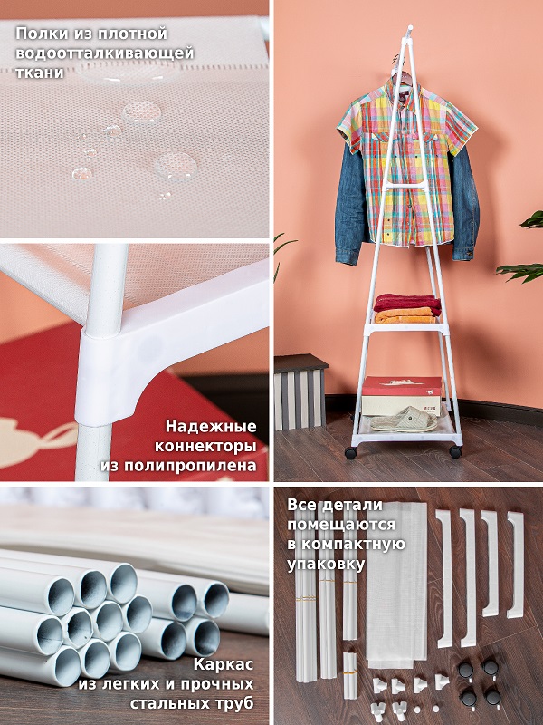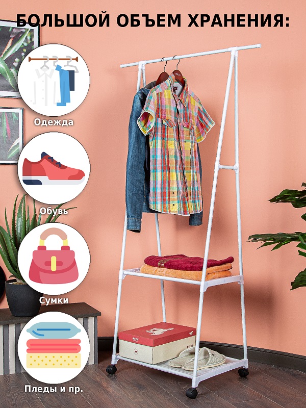 Напольная вешалка для одежды станет современной заменой шкафу и поможет в хранении самых разных вещей. Она организует пространство в прихожей, детской, гардеробной, спальне, коридере, ванной комнате или на балконе. Стойка перемещается на пластиковых колесиках, она передвижная и многофункциональная.На перекладину помещается больше 10 плечиков с брюками, юбками, рубашками, штанами, футболками, шарфами, платками и верхней одеждой. А под штангой есть большая полка для хранения обуви в чехлах и полочка для сумок и органайзеров для белья.