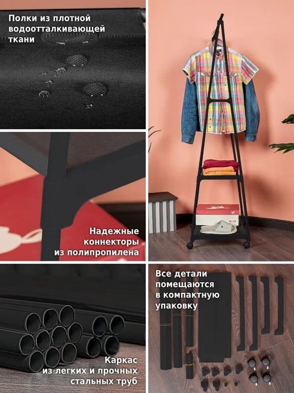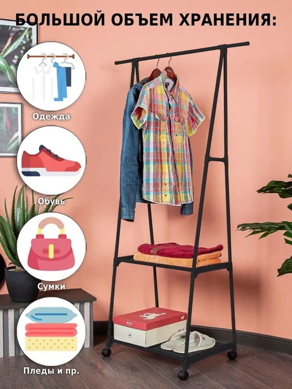 Напольная вешалка для одежды станет современной заменой шкафу и поможет в хранении самых разных вещей. Она организует пространство в прихожей, детской, гардеробной, спальне, коридере, ванной комнате или на балконе. Стойка перемещается на пластиковых колесиках, она передвижная и многофункциональная.На перекладину помещается больше 10 плечиков с брюками, юбками, рубашками, штанами, футболками, шарфами, платками и верхней одеждой. А под штангой есть большая полка для хранения обуви в чехлах и полочка для сумок и органайзеров для белья.