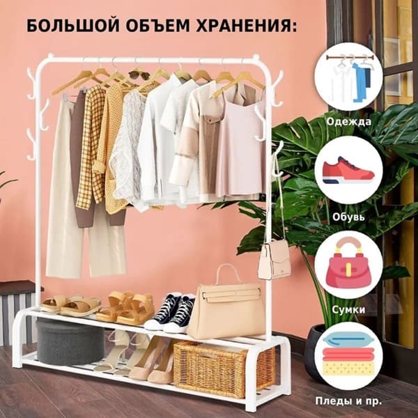 Вешалка имеет два рейла для одежды и одну полку. На рейле можно повесить верхнюю одежду, пиджаки, платья, рубашки, толстовки и свитшоты. Ее можно использовать как вешалку для брюк и юбок, а также как вешалку для полотенец. Полки пригодятся для аккуратного хранения корзин с бельем и полотенцами, ящиков с мелкой одеждой (носки, колготки, белье,…), контейнеров и органайзеров с женскими аксессуарами, платками, перчатками, ремнями и т.п. Также полки можно использовать для хранения обуви, сумок и головных уборов. Благодаря тому, что полки подходят для хранения обуви, напольная вешалка может заменить стеллаж для обуви - обувницу для прихожей.Кроме того, ее можно использовать как детскую вешалку для одежды и стеллаж для игрушек. Даже малыши легко достанут контейнер с любимыми игрушками с нижней полки.