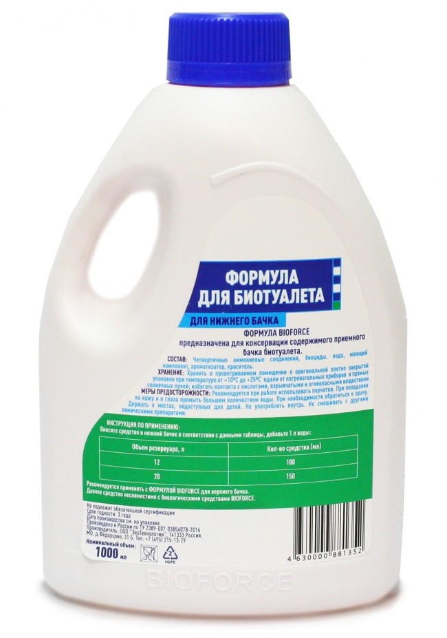 Жидкость для биотуалета ФОРМУЛА BIOFORCE для нижнего бачка. Может применяться как средство для дачного туалета с ведром. Концентрат имеет приятный запах и предназначено для консервации и обеззараживания содержимого нижнего бачка биотуалета или туалетного ведра.