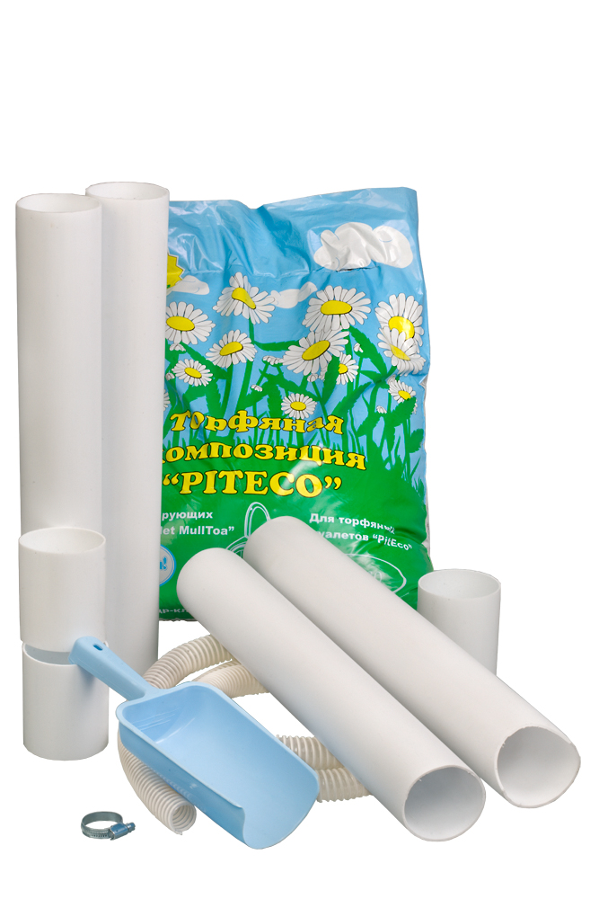 В упаковке туалета в базовой комплектации Вы найдёте 2 метра вентиляционной трубы+ 3 муфты, дренажный шланг 2 метра + один хомут для его крепления, мешок торфяной смеси, сиденье для унитаза с крышкой, паспорт изделия и инструкцию. И, конечно сам торфяной туалет в собранном виде и готовым к эксплуатации после выполнения нескольких несложных операций, оговоренных в инструкции по эксплуатации изделия.