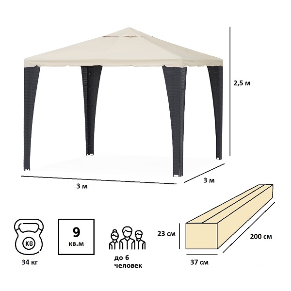 Тент шатер Green Glade YF-3176B имеет прочный металлический каркас из металлических труб, поперечной балки и восьми столбов (20x20мм труба, 20x20мм поперечная балка, 10x20мм столб). Стенки и крыша тента выполнены из прочного полиэстера с покрытием из водостойкого поливинилхлорида плотностью 250гр/м.кв. Покрытие столбов - полиротанг. Размеры шатра 300х300 см, высота 250 cм.