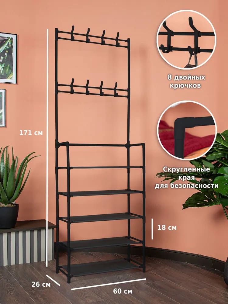 Вешалка органайзер вмещает в себя большое количество различных вещей, а небольшие размеры и современный дизайн позволяют грамотно вписать ее в любое пространство. Также может использоваться как вешалка для детской одежды. Складная открытая вешалка стойка трансформер выполнена из легких металлических труб и пластиковых соединительных элементов, собирается легко и быстро.