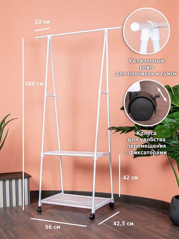 Напольная вешалка для одежды станет современной заменой шкафу и поможет в хранении самых разных вещей. Она организует пространство в прихожей, детской, гардеробной, спальне, коридере, ванной комнате или на балконе. Стойка перемещается на пластиковых колесиках, она передвижная и многофункциональная.На перекладину помещается больше 10 плечиков с брюками, юбками, рубашками, штанами, футболками, шарфами, платками и верхней одеждой. А под штангой есть большая полка для хранения обуви в чехлах и полочка для сумок и органайзеров для белья.